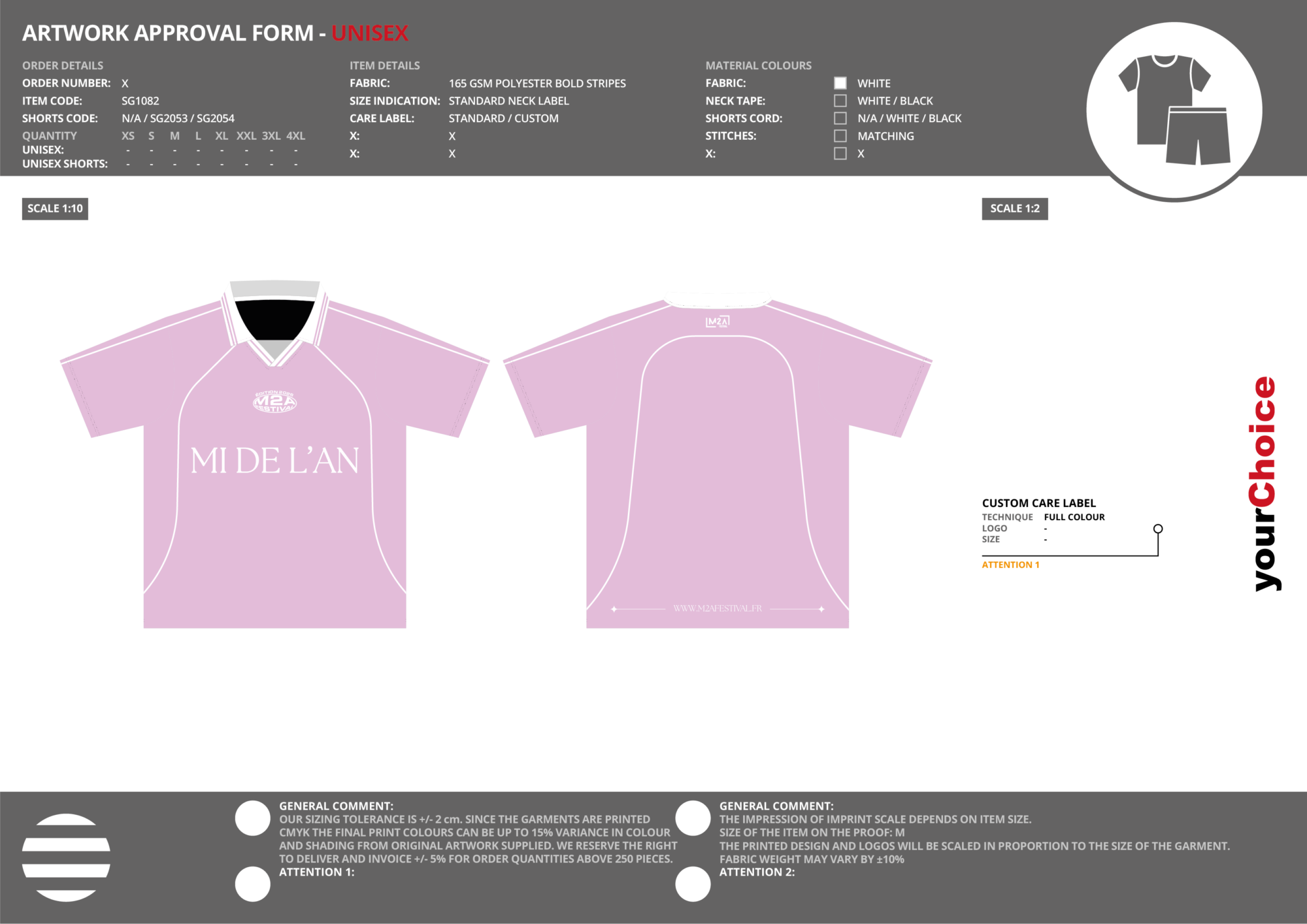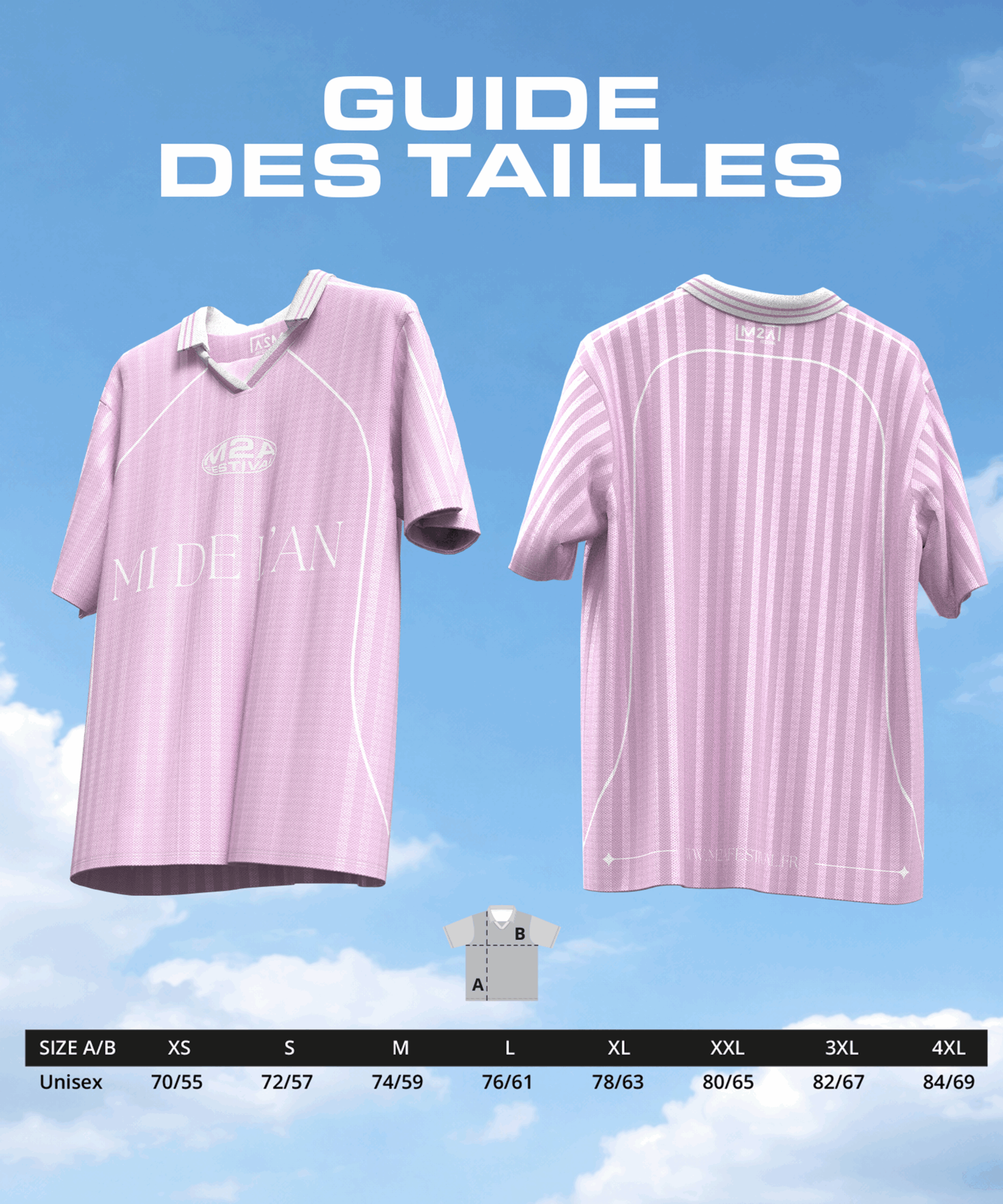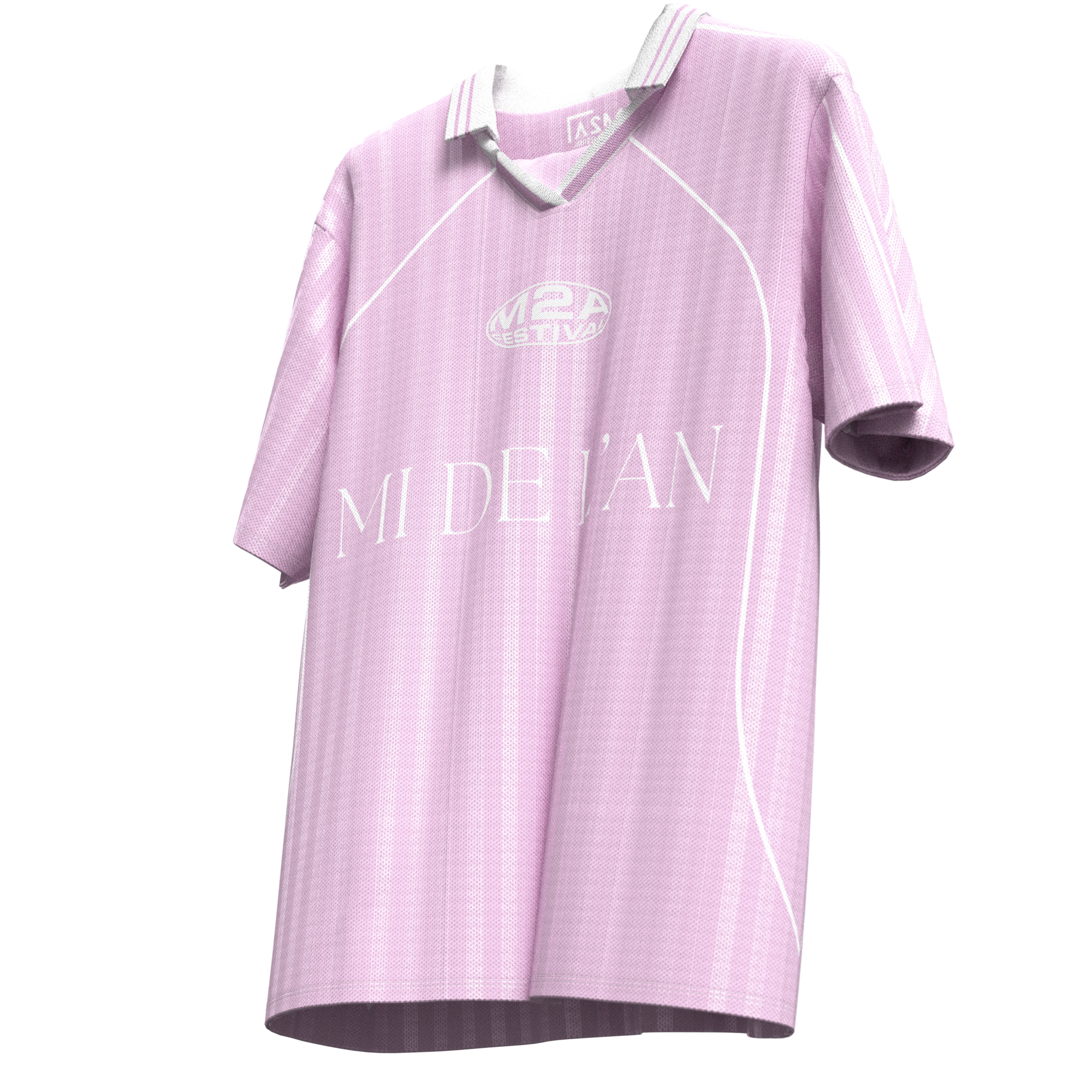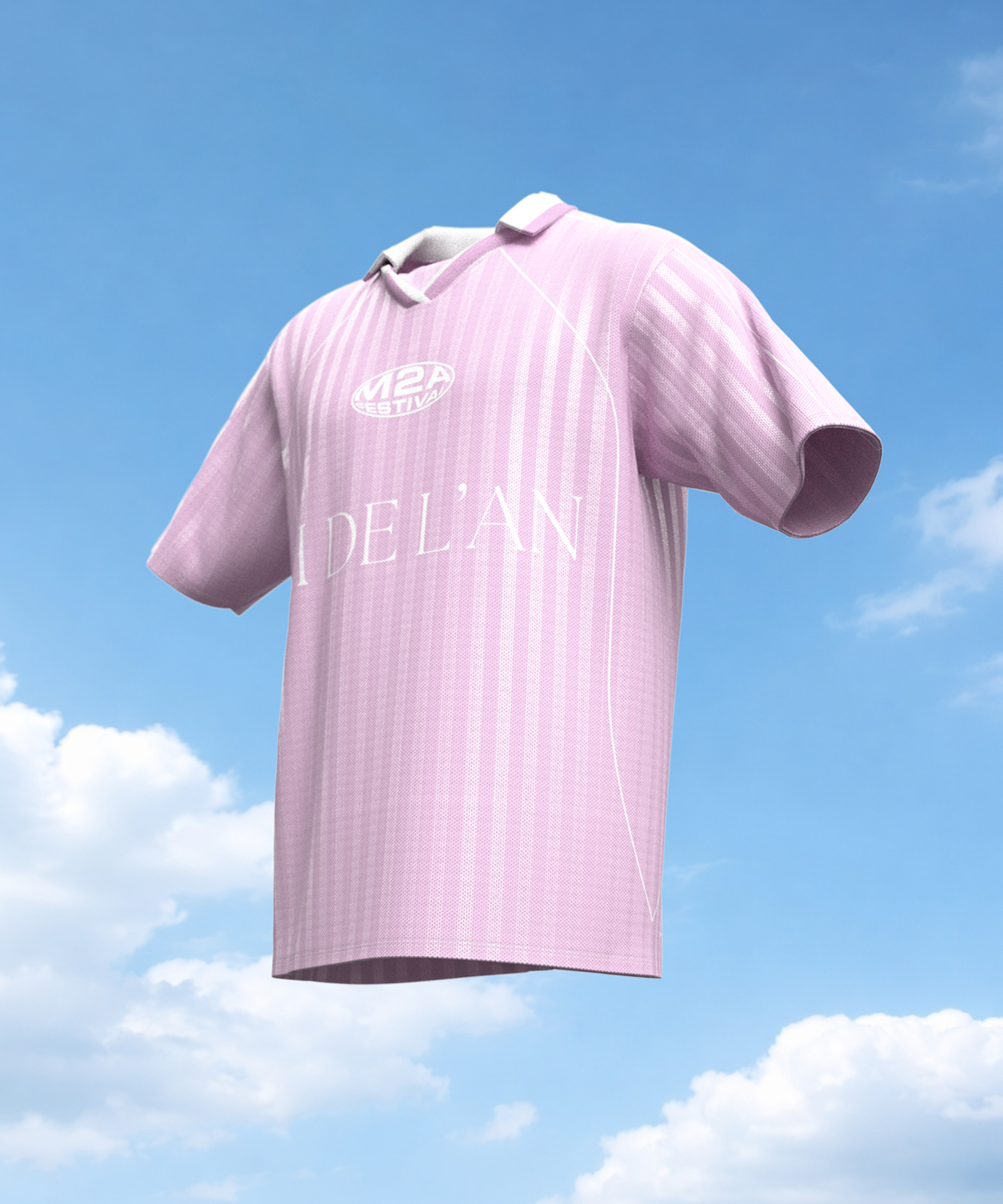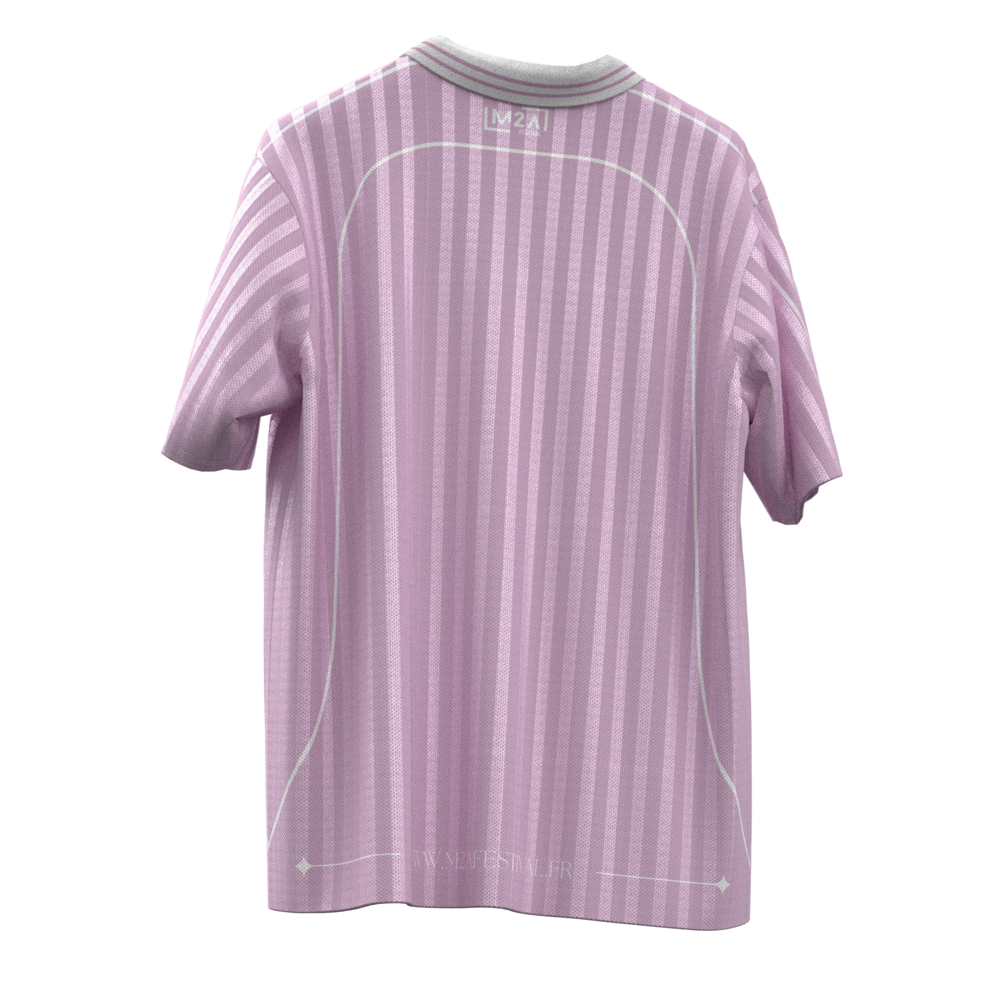 Le visuel a été développé via une modélisation 3D (sur Clo3D), permettant un rendu fidèle des matières, du tombé du tissu et des détails techniques comme le col polo contrasté et les rayures verticales vintage. L’enjeu était de transformer un produit dérivé en une véritable pièce de collection « lifestyle », incarnant l’esprit de partage et la créativité du M2A.